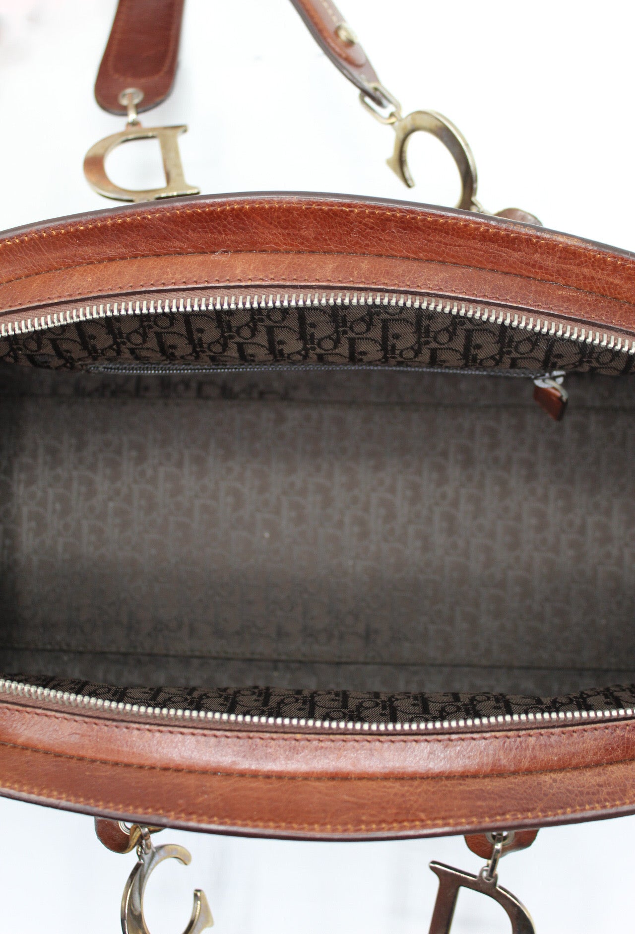 Ultra-special vintage 2005 bag by John Galliano for Dior. Cognac leather bowler bag with floral embroidered design on front and signature ‘C’ and ‘D’ silver accents. Top-handle. Silver zipper closure. Diorissimo jacquard logo lining and 1 interior zip pocket. Protective metal feet at base.