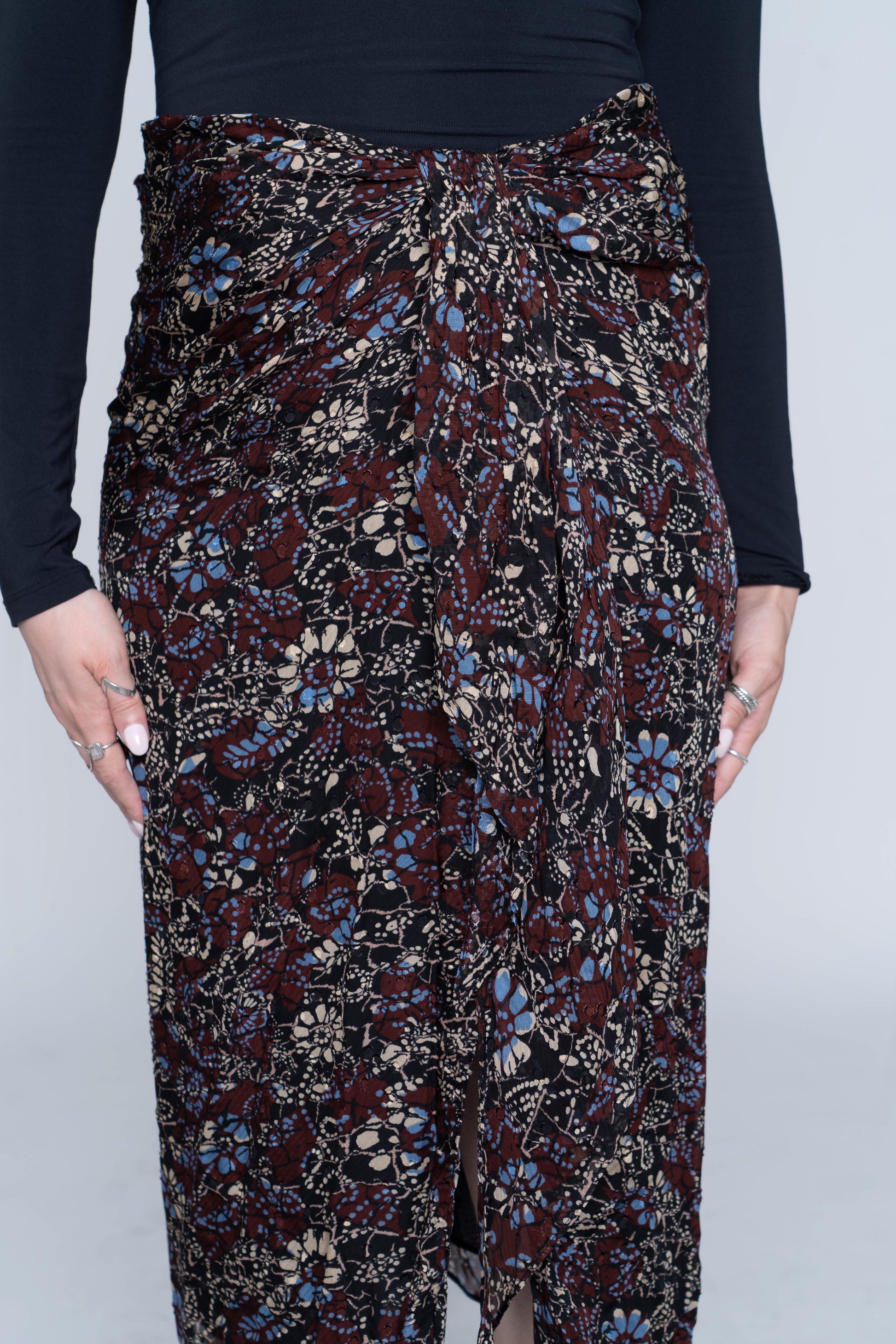 ‘Galia’ midi skirt by Ba&sh in color ‘Carbon’. Silky, lightweight midi skirt with decorative front wrap. All over ruching with front slit. Lined. Invisible center back zipper and hook & eye closure. 100% Viscose.