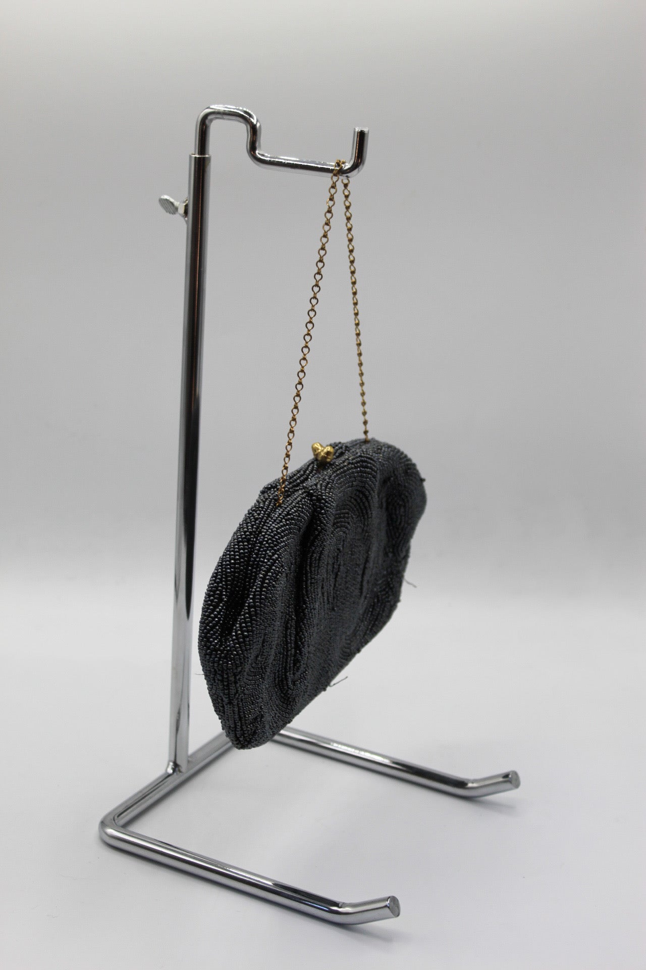 Vintage clutch handmade in Japan. Allover black beading with lavender satin interior. Small gold chain attached via 2 interior loops. Brass kiss-lock closure. 1 interior pocket.