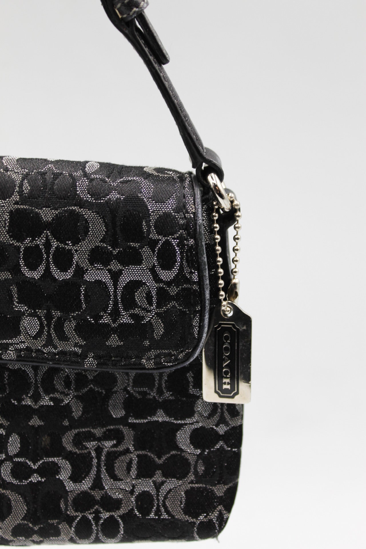 Vintage Coach Demi Clip bag from 2004. Adorable mini purse in lightweight canvas with all over metallic jacquard logo design. Metallic leather and lavender canvas interior. Black leather strap. Silver hardware. 1 interior zipper pocket.