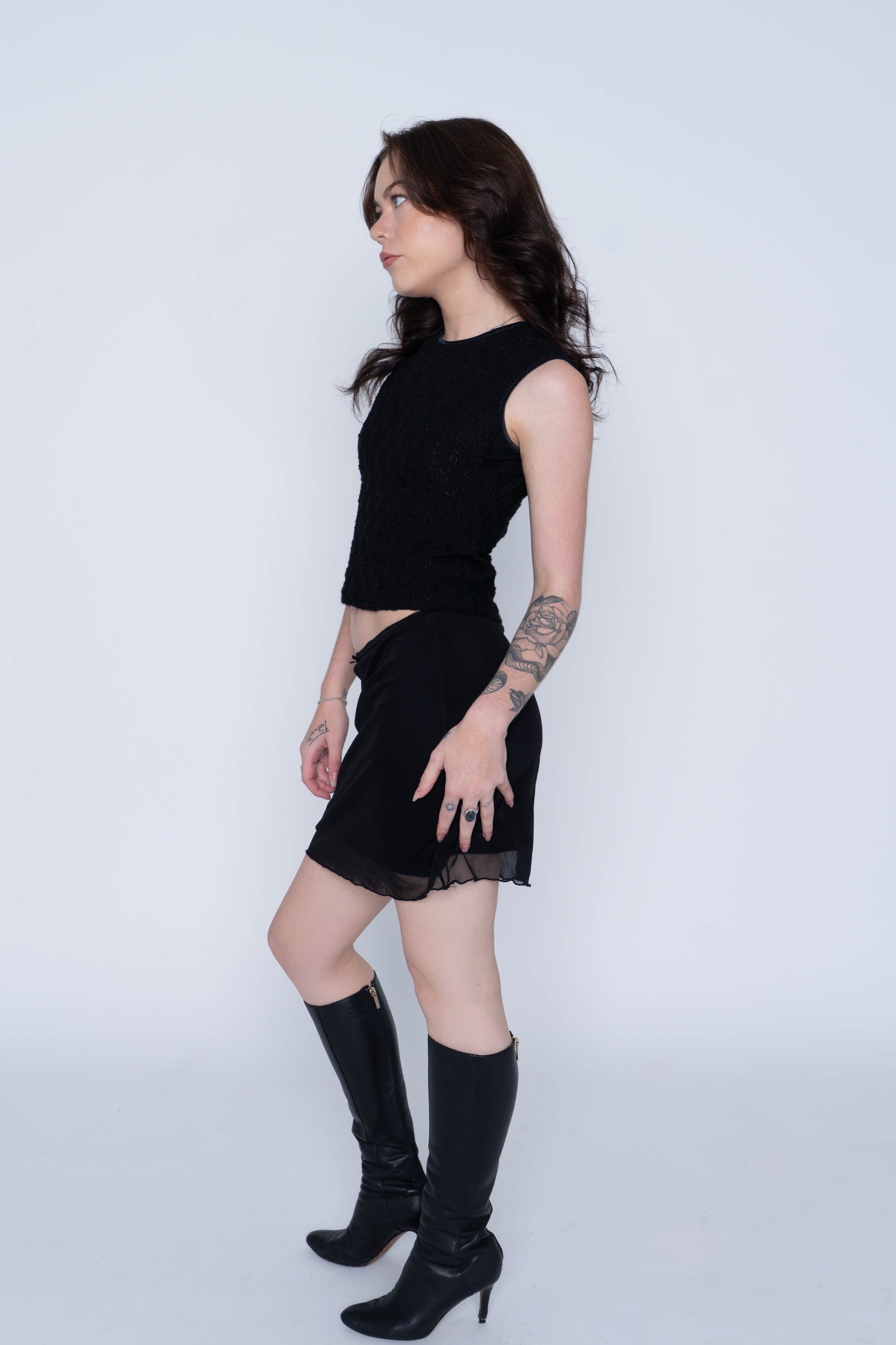 Double-lined black mesh tank top with all-over black knit floral embroidery. Sleeveless, round neck. Semi-sheer. Elasticized sleeves and neckline with keyhole and bow detail at back collar. 100% nylon.