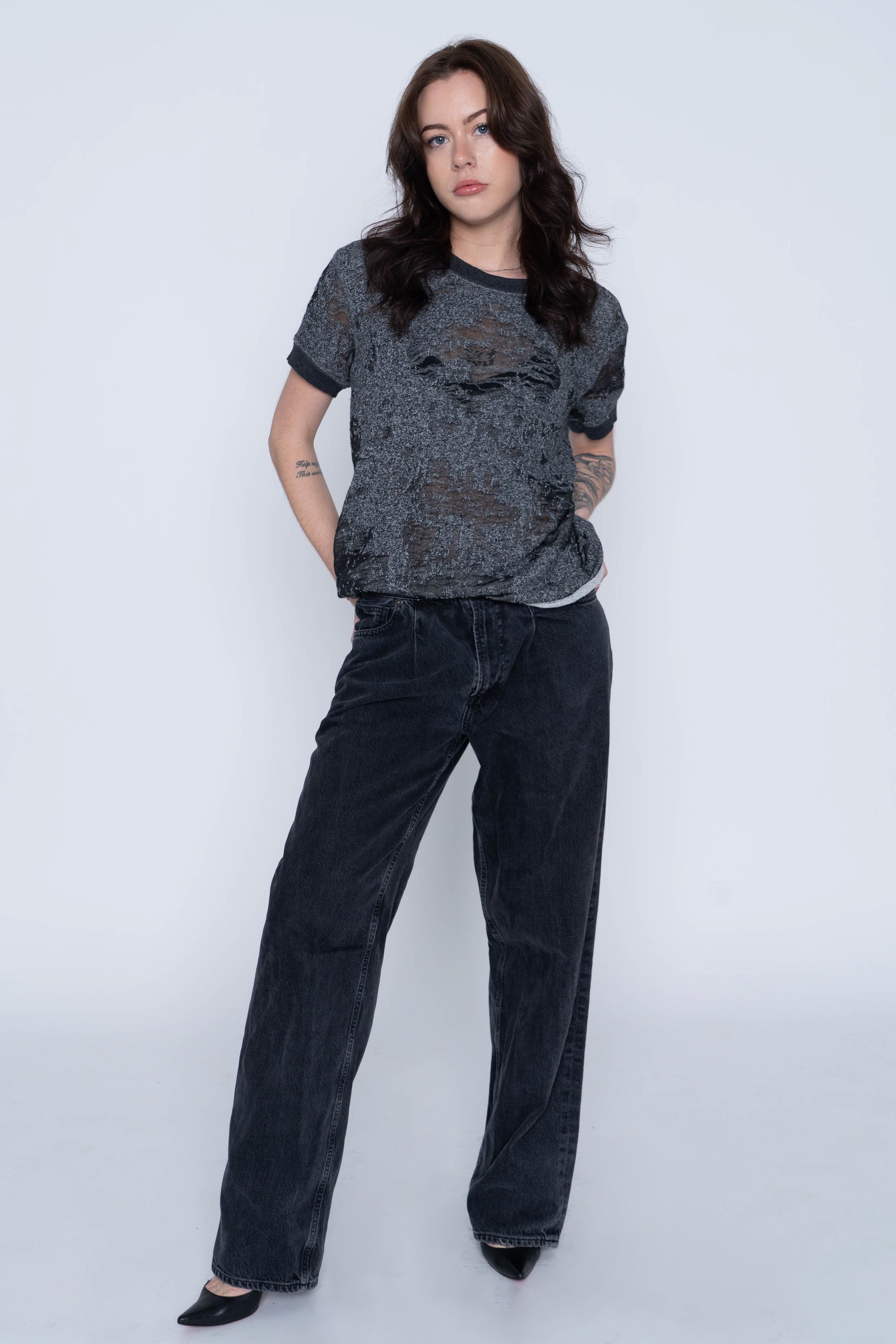 ‘Nasta’ distressed tee from IRO Jeans in dark grey. Super-soft, raw-hem distressed tee with mesh accents. Relaxed fit. 54% cotton/36% polyester/10% rayon.