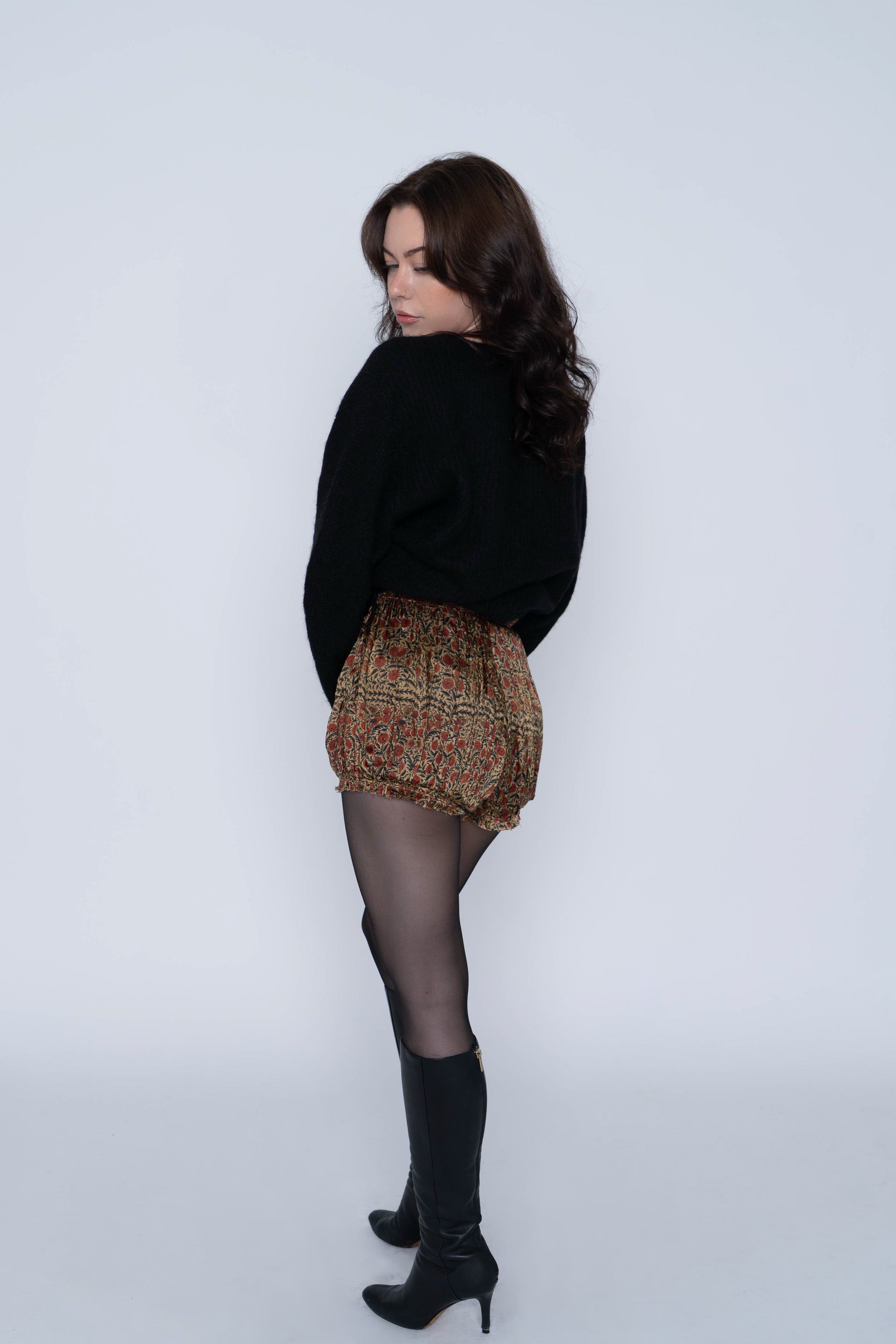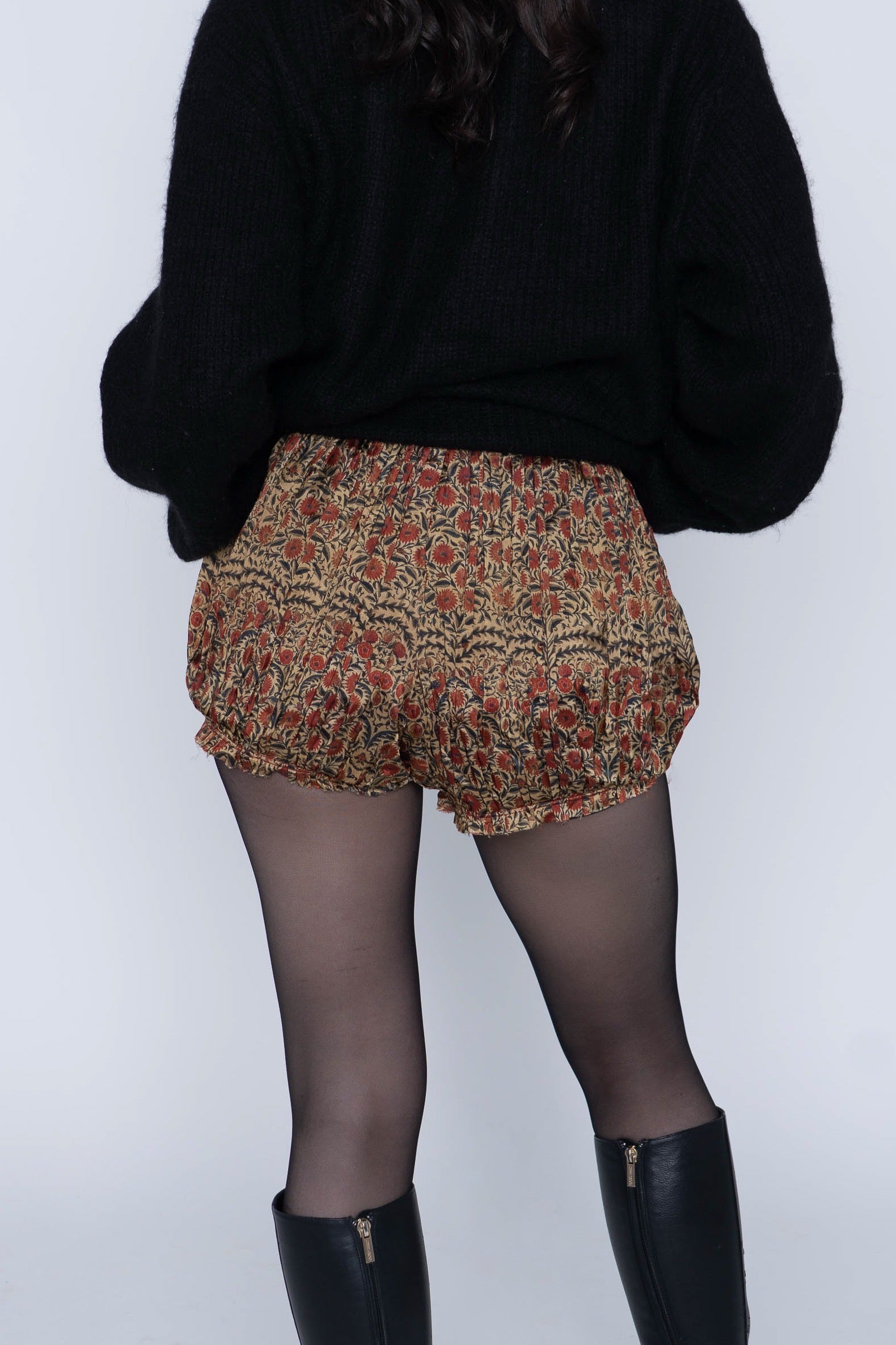 Khaite silky-soft, pleated floral micro-shorts with ruched hem and waistline. Invisible side zipper and hook & eye closure. Gold/bronze tone fabric with Autumnal floral print. Shell is 60% Viscose/40% Cupro (“vegan silk”). Fully lined with 100% Cotton, maroon-color lining. High rise. Non-stretch, mid-weight fabric. Made in Turkey. Like new.