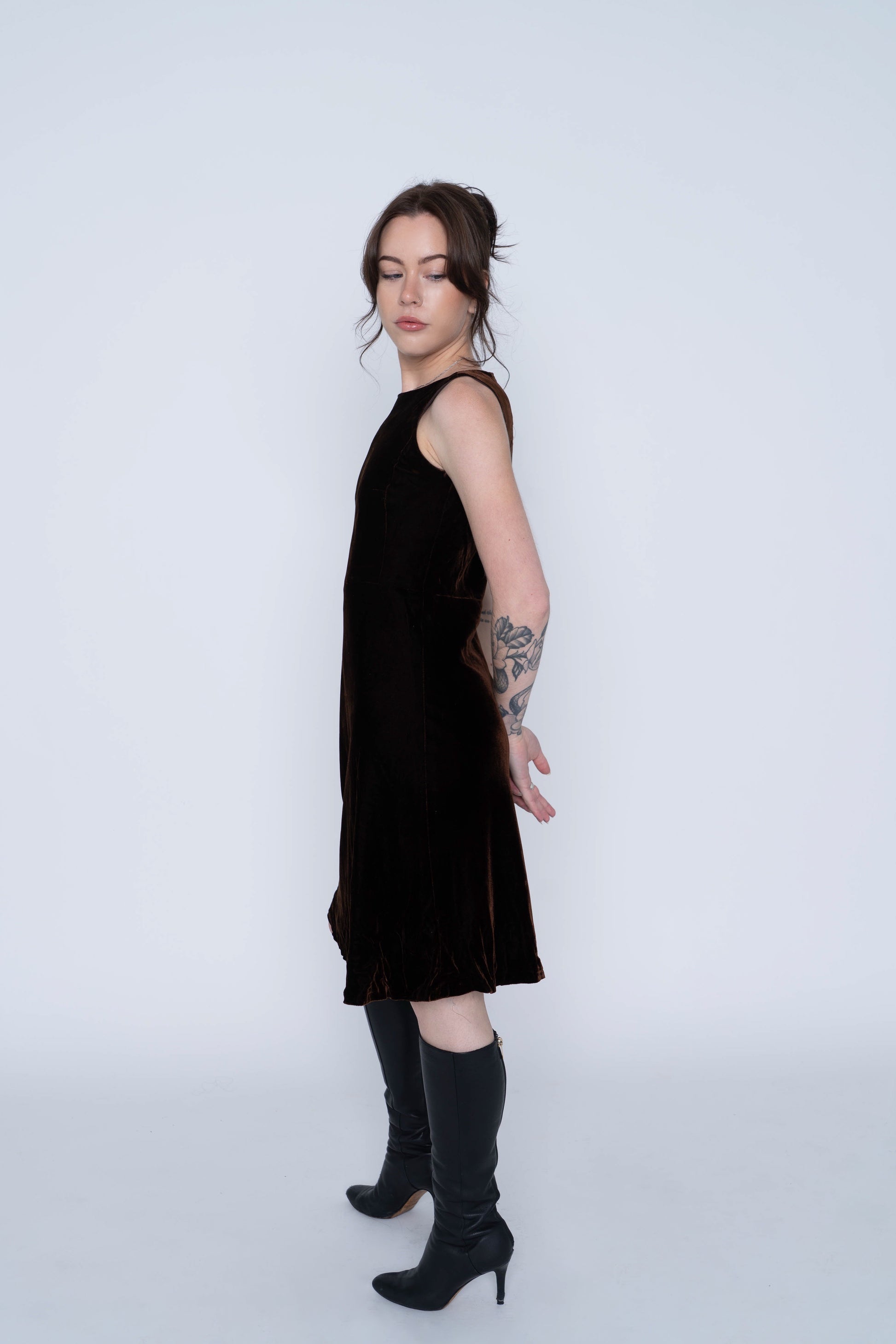 Vintage brown velvet sheath dress. Jewel neckline. Sleeveless. Knee-length. Back center invisible zipper closure.