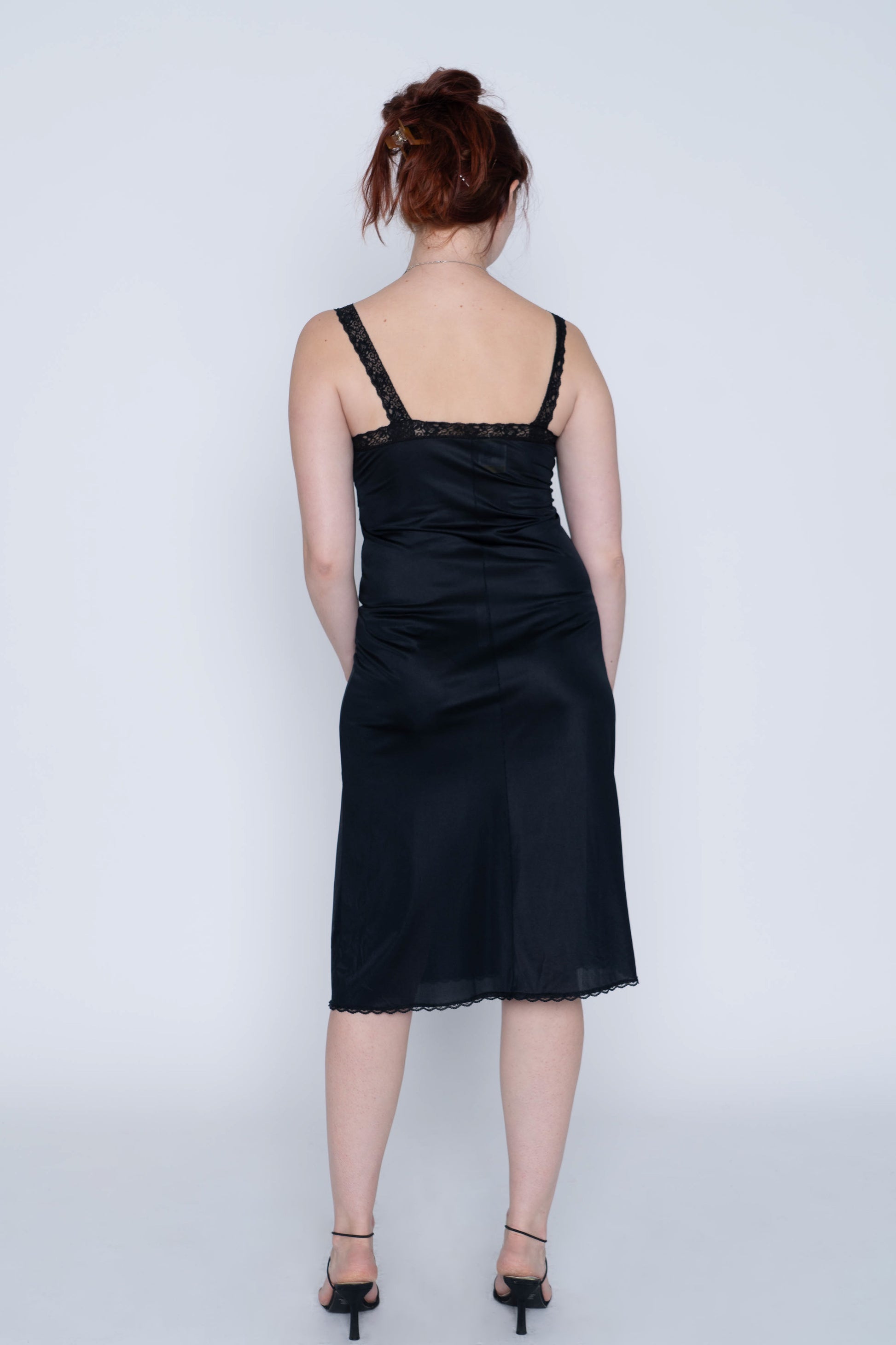 Classic, lightweight black vintage satin and lace maxi slip. Square neck. Non-adjustable straps.